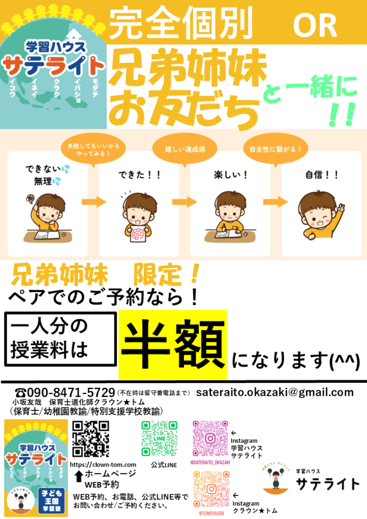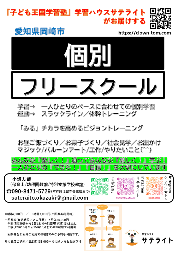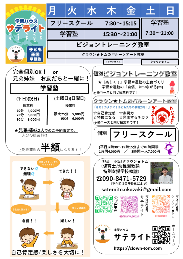『子ども王国学習塾』学習ハウスサテライトでは、【みんなが】『楽しく!』通って、【みんなが】『楽しく!』学ぶことができる個別学習塾、個別ビジョントレーニング教室、個別フリースクール、バルーンアート教室をお届けさせていただいています(^^)